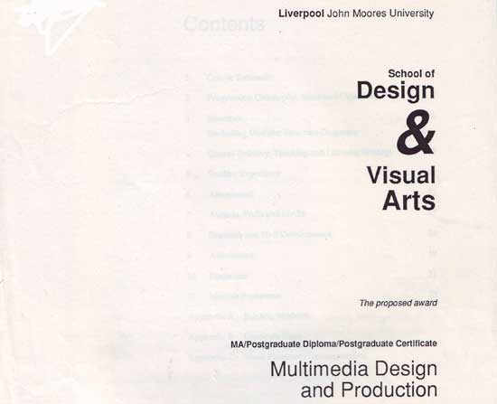 I began lecturing in 1995 as a module leader on the MA Multimedia Arts programme. This was the first such course in the country, drawing on the practical expertise of the staff from the Learning Methods Unit and underpined by the academic excellence of the Liverpool Art School